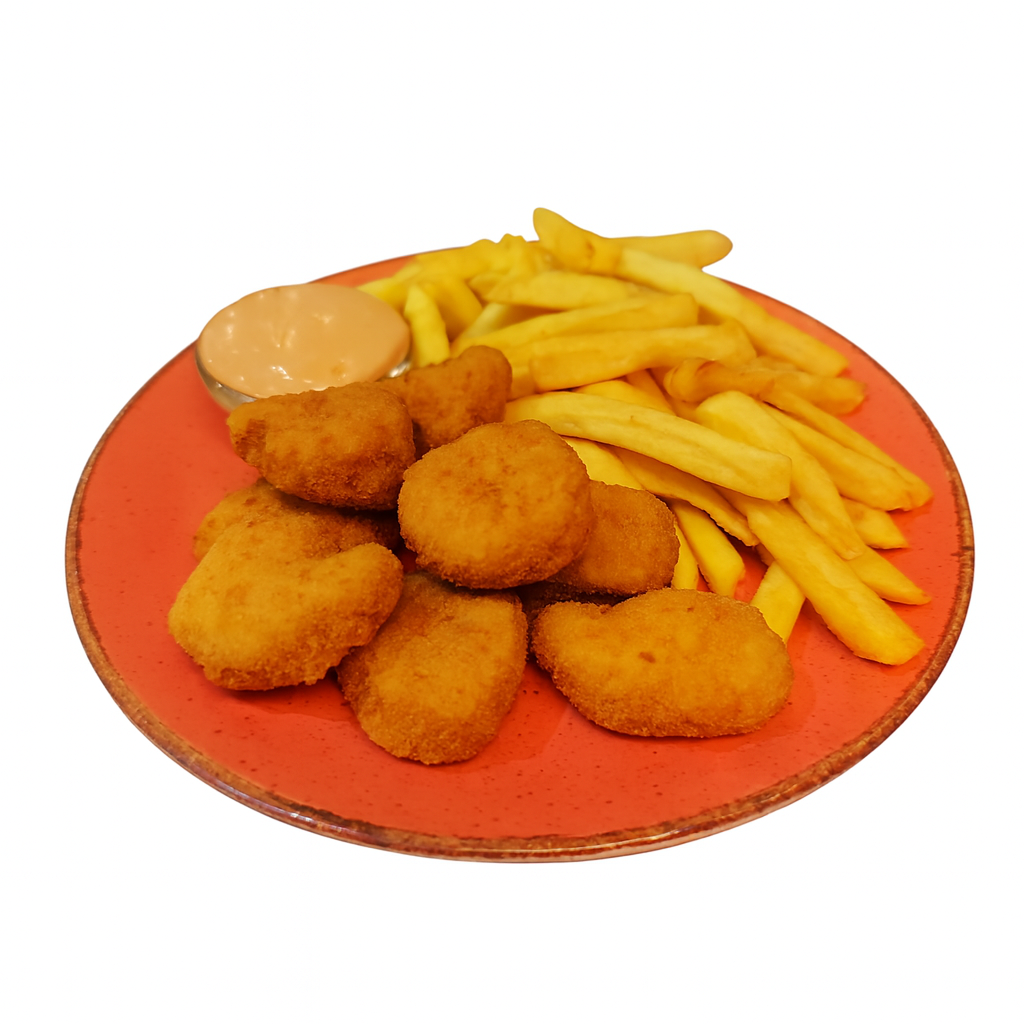 Ingrediente: nuggets pui 100 gr (piept de pui 60%, făină de grâu, extract de drojdie, condimente, făină de orez și de porumb, amidon din cartofi, praf de ou, ulei vegetal din floarea soarelui), cartofi prăjiți 100 gr, sos Mediterana 50 gr.